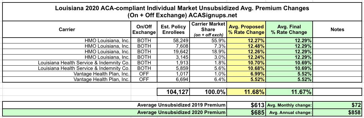 Louisiana: *Final* avg. 2020 ACA premiums: 11.7% increase