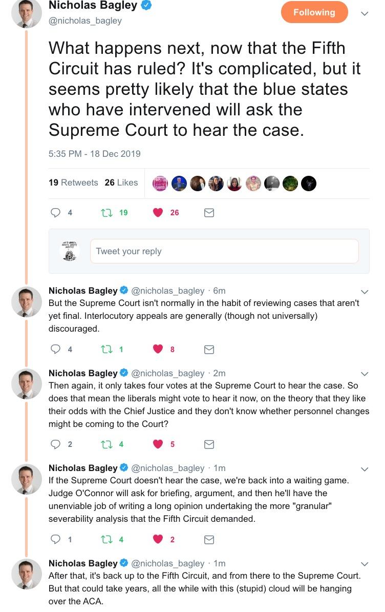 If the SCOTUS doesn't agree to take it until Judge O'Connor has chimed in again and it's gone back from him up to the Fifth Circuit again, then, as Bagley notes, it could be another year or more before it gets to SCOTUS...who will then take another six months or whatever to issue their final ruling. At that point we're likely into 2021 or later.