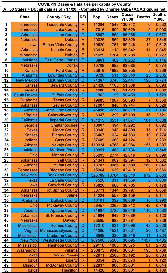 Here's the top 100 counties ranked by per capita COVID-19 fatalities as of Saturday, July 18th (click image for high-res version):
