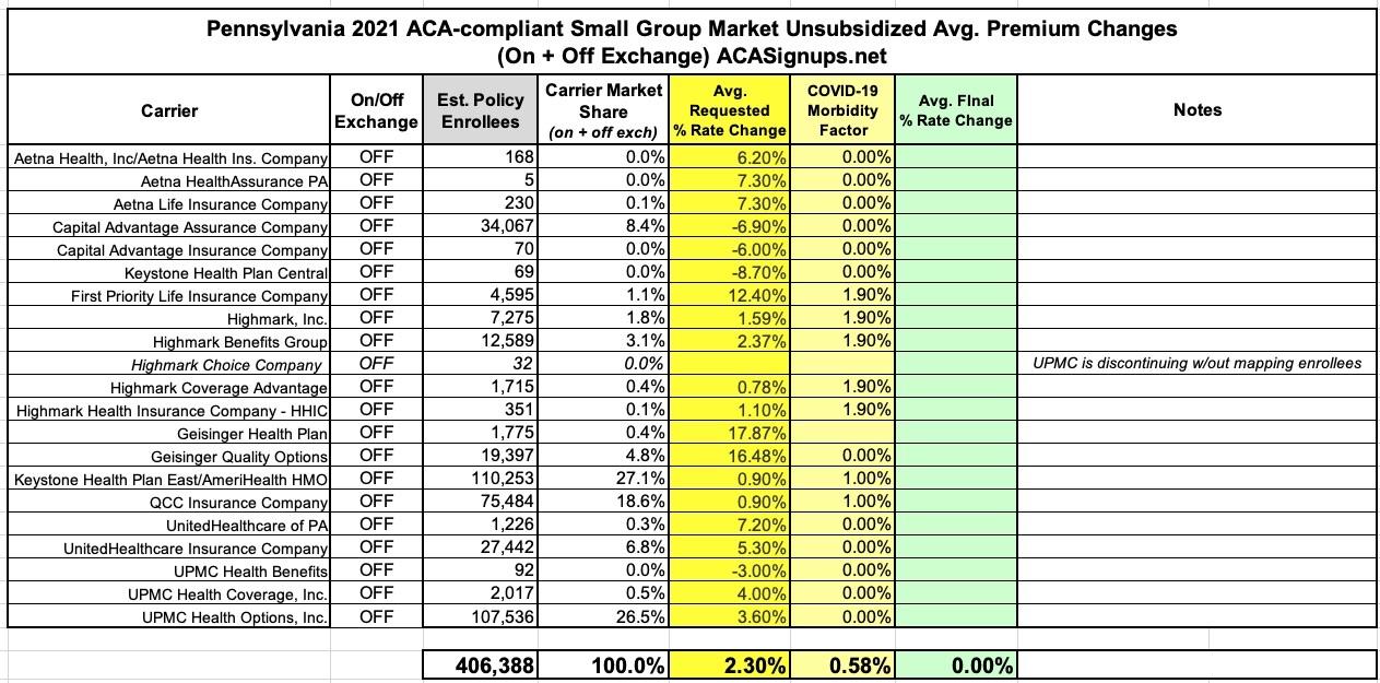 Pennsylvania: Preliminary avg. 2021 #ACA premiums: -2.6% indy market, +2.3% sm. group