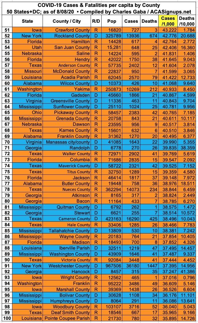 Here's the top 100 counties ranked by per capita COVID-19 cases as of Saturday, August 8th (click image for high-res version):