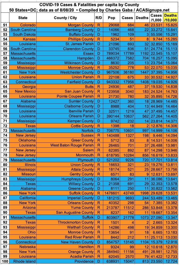 Here's the top 100 counties ranked by per capita COVID-19 fatalities as of Saturday, August 8th (click image for high-res version):
