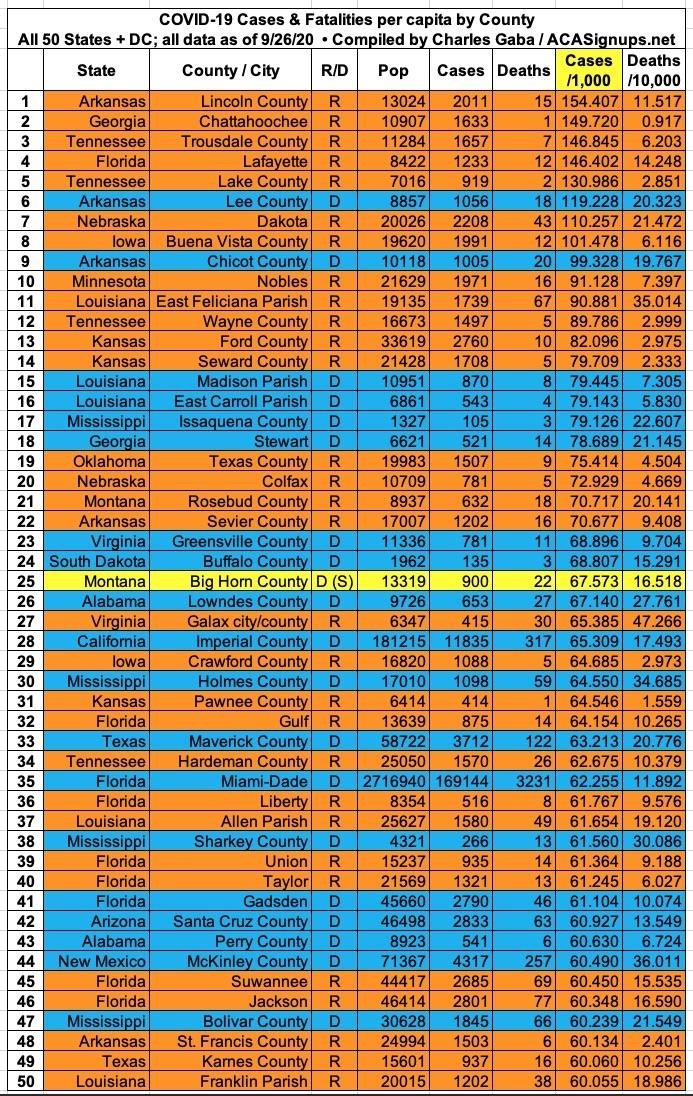 With these updates in mind, here's the top 100 counties ranked by per capita COVID-19 cases as of Saturday, September 26th (click image for high-res version). Blue = Hillary Clinton won by more than 6 points; Orange = Donald Trump won by more than 6 points; Yellow = Swing District