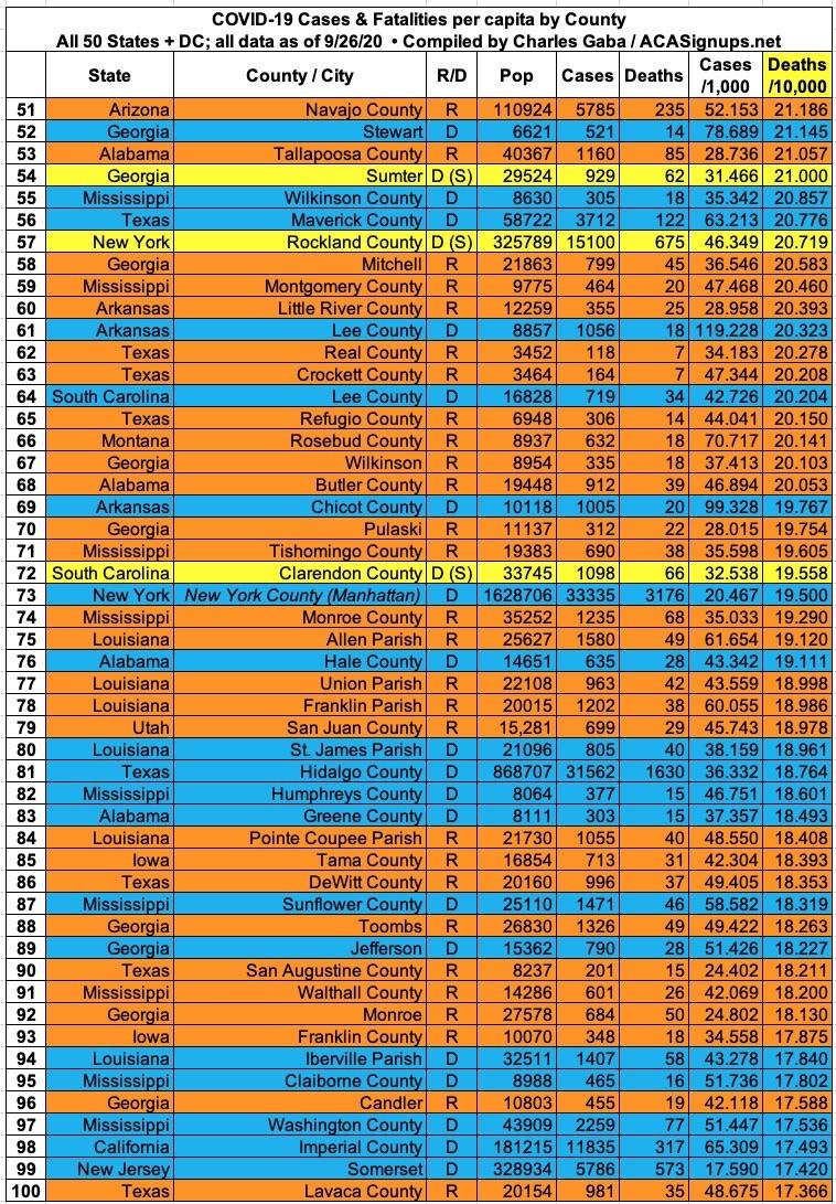 Here's the top 100 counties ranked by per capita COVID-19 fatalities as of Saturday, September 26th (click image for high-res version):