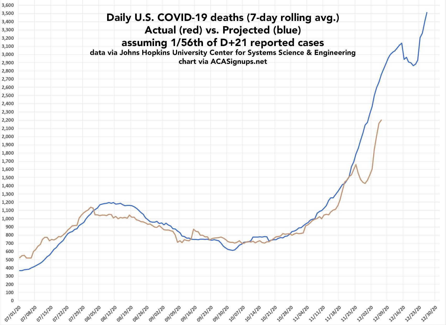 This was a very specific projection (especially the 4,000 deaths on 12/26) so I decided to do the math. Deaths have been lagging positive tests by around three weeks, give or take, so in theory you should just have to go back to see how many people tested positive 21 days earlier to get an idea of how many people will die on a given day...as well as letting you project the death toll up to three weeks ahead, as Dr. Jha did above.