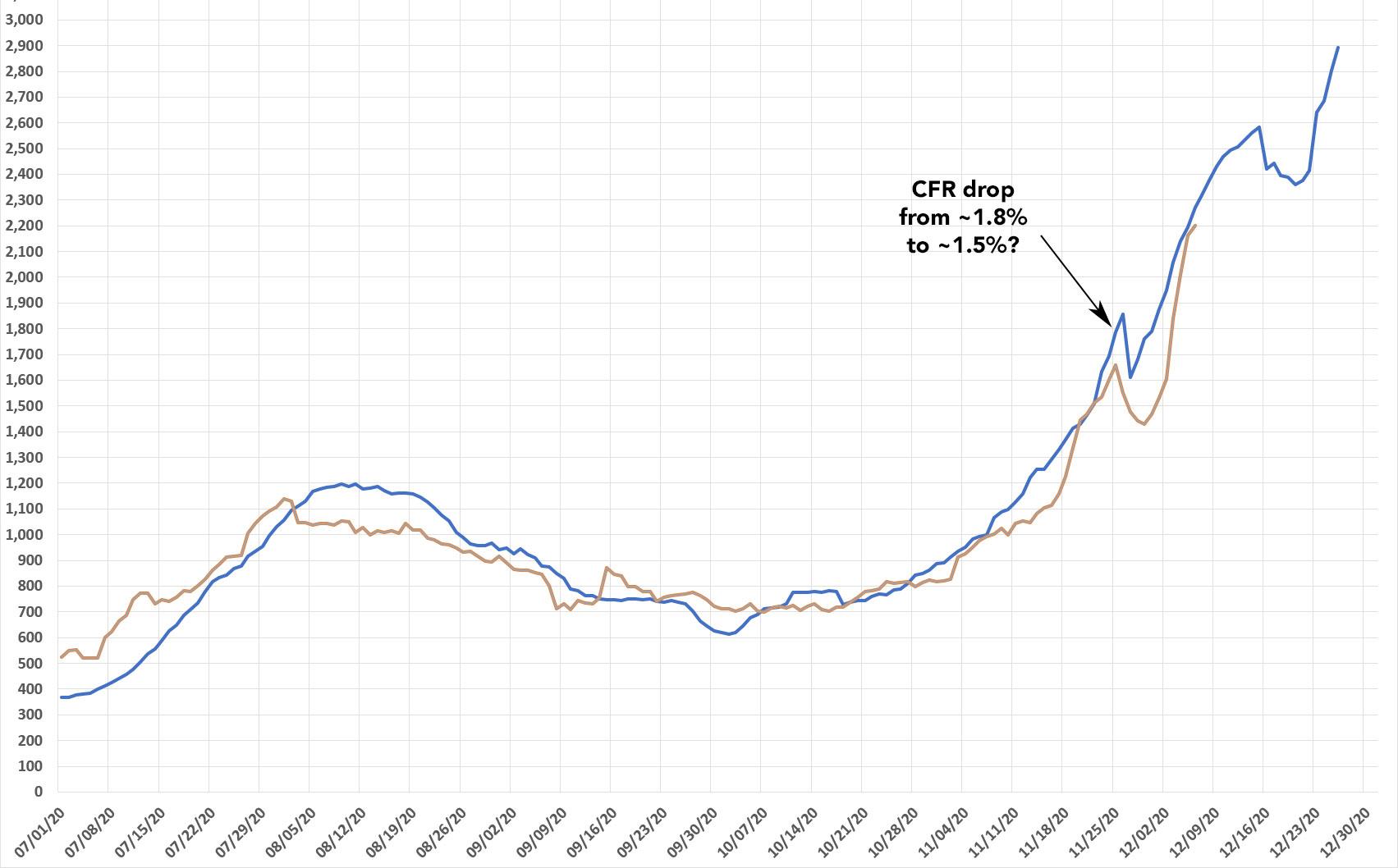 Note: That Thanksgiving reporting drop-off really messed things up. I don't know if some deaths from a week and a half ago still haven't been reported or what, but if it turns out there has been a significant drop in the CFR (from ~1.8% down to, say, 1.5%), the model would look more like the chart below, which is much closer to the actual reported deaths over the past 10 days. This would be great news as it would mean around 20% fewer people dying each day.