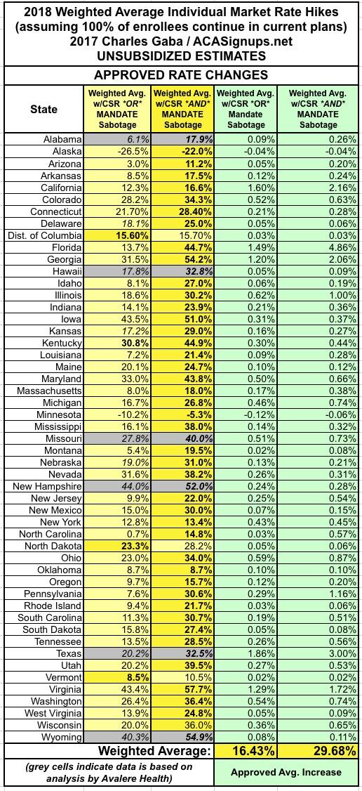 UPATE 7/6/17: GEORGIA ADDED: There are now 17 STATES representing 31.9% of the population included, with a weighted average requested rate hike of up to 15.1% with a PARTIAL Trump/GOP Sabotage Tax or 34.2% with the FULL Trump/GOP Sabotage Tax included.