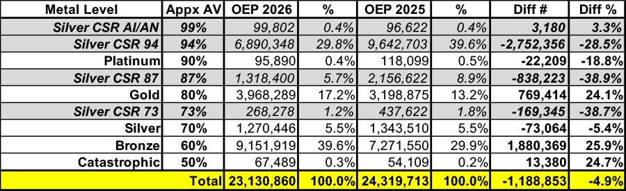 This also means that anyone who moved from a CSR 87, 94 or AI/AN plan in 2025 to a Gold plan in 2026 actually downgraded the Actuarial Value of their coverage in the process.