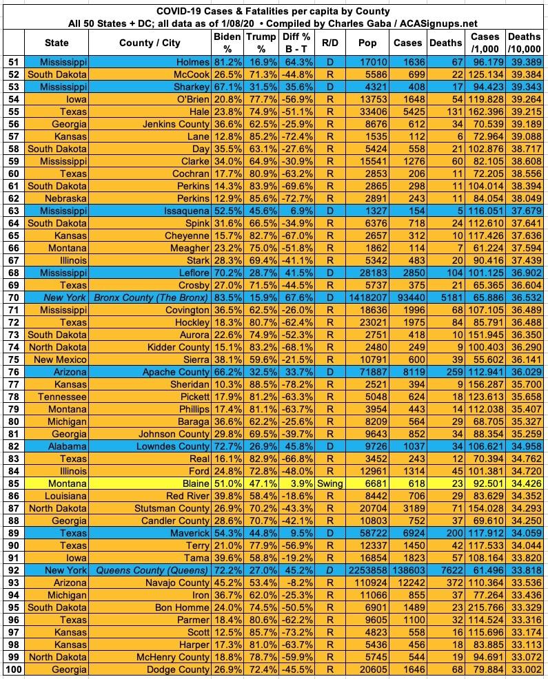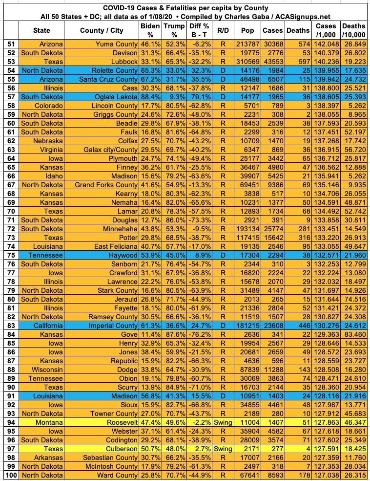 Here's the top 100 counties ranked by per capita COVID-19 fatalities as of Friday, January 8th, 2021 (click image for high-res version):
