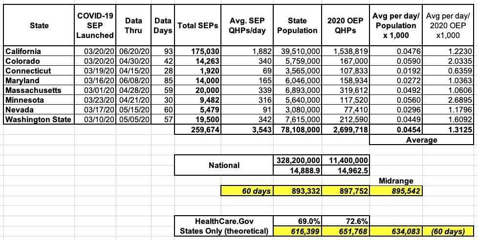 Even with all of that, I was able to cobble together what seems like a reasonably accurate overview of how many additional people enrolled in ACA exchange plans specifically thanks to the COVID SEP. I came up with roughly 260,000 additional Qualified Health Plan (QHP) selections, which I extrapolated into somewhere around 900,000 nationally if every state offered and promoted a full 60-day "no reason needed" SEP: