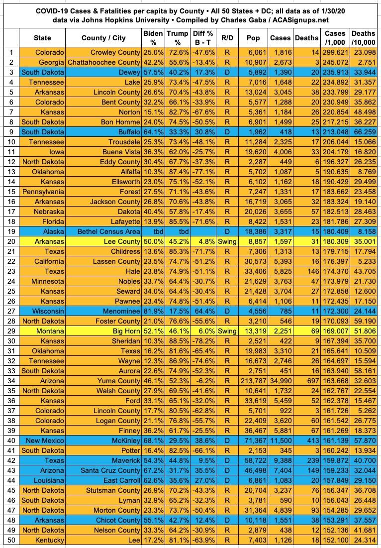As of today, both cumulative COVID-19 Cases and Deaths per capita are running higher in the Red Counties: