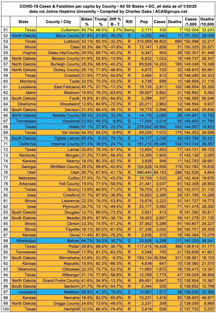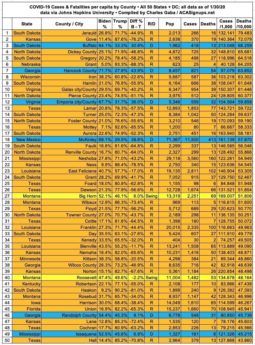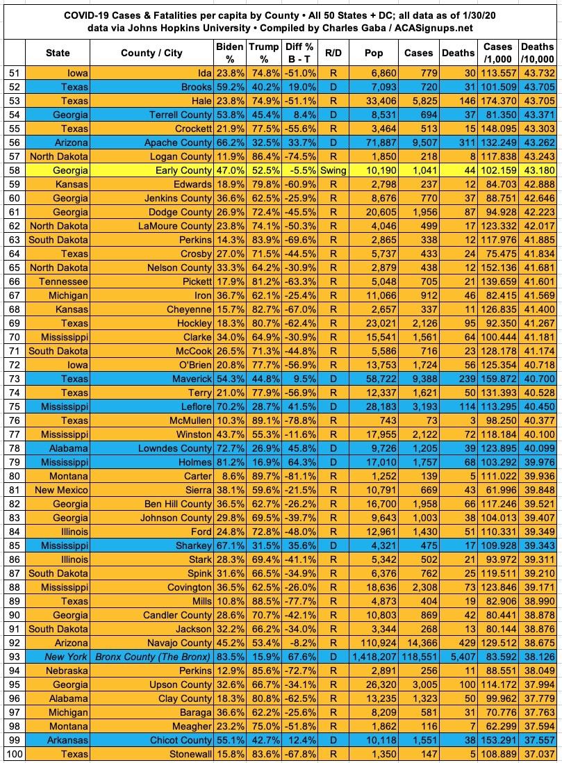 Here's the top 100 counties ranked by per capita COVID-19 fatalities as of Saturday, January 30th, 2021 (click image for high-res version):