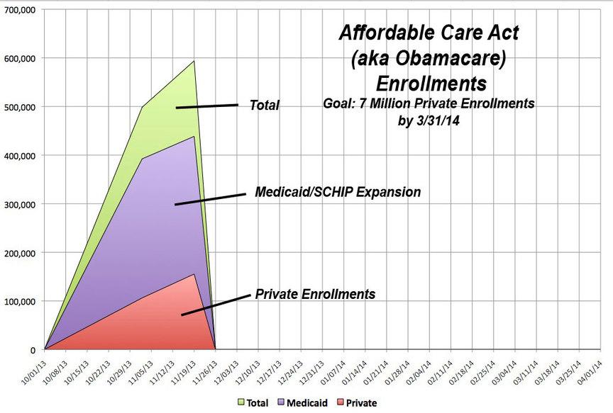 As an illustration: If the number of actual enrollments doubles each month, that would be 100K + 200K + 400K + 800K + 1.6M + 3.2M = 6.3 million people by 3/31/14, very close to the 7 million goal. And this trend was far greater in Massachusetts when they launched Obamacare RomneyCare; only 123 people enrolled the first month; by the 4th month it was up to 15,500.