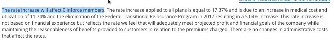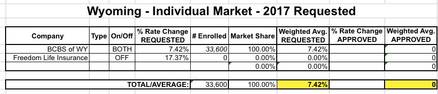 That left Blue Cross Blue Shield of Wyoming as the sole carrier providing individual policies in the states other than Freedom Life Insurance, which only sells off-exchange policies and (from their filing for 2017 below) doesn't appear to have anyone enrolled in them at the moment anyway. You would think that this would mean BCBS would take advantage of their monopoly to jack up prices dramatically...but it appears that a combination of the ACA's 80/20 Medical Loss Ratio rule, along with state insurance regulators who are presumably taking their jobs seriously, have resulted in a surprisingly low (for this year) requested rate increase: