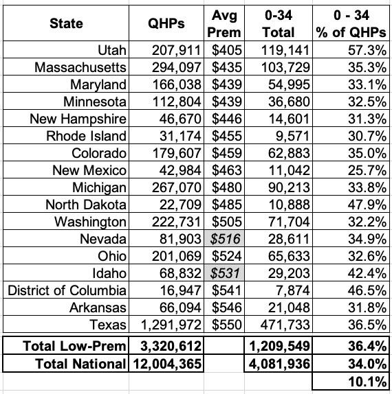 I've filled in the average premiums for two missing states (Idaho & Nevada) based on my own estimates from last fall. The 17 states which have the lowest 1/3 of average premiums are below, along with total OEP enrollment and the number of enrollees age 0 - 34 in each state: