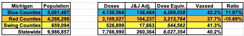 ...On the vaccine front, meanwhile...yep, as of today, Michigan's handful of large Blue counties (the 12 counties which voted for Biden last fall have 55% of the population) have vaccinated 36.2% of their residents, while the other 71 Trump-voting counties have only vaccinated 32.9% of theirs.