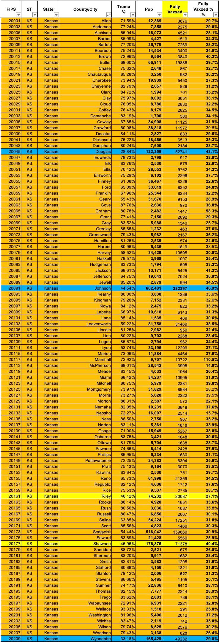 Kansas: #COVID19 vaccination rates by county & partisan lean