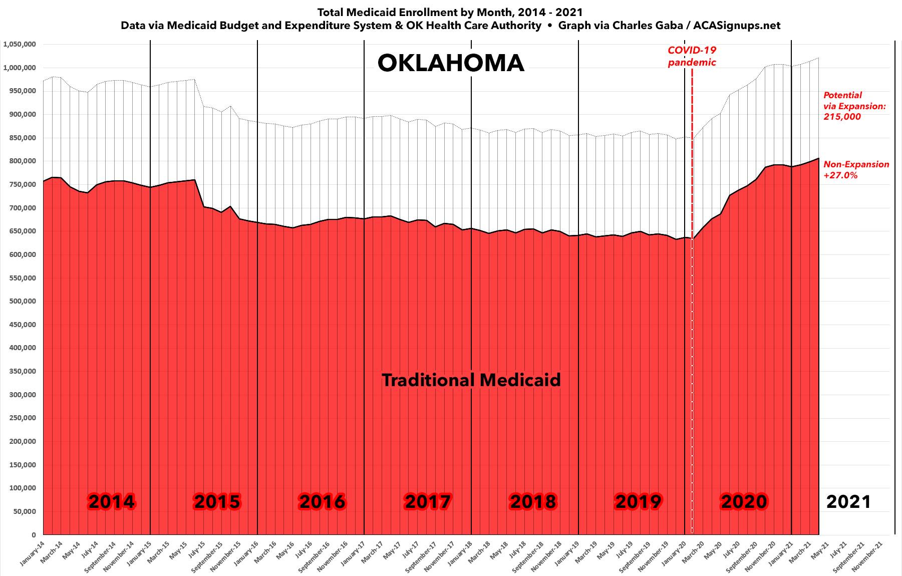 Oklahoma: Medicaid enrollment up 27% since COVID hit; up to 215,000 more about to enroll starting July 1st
