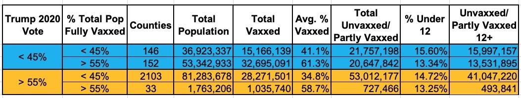 These counties also have a slightly lower average percent of children under 12 years old than most of the country, which actually makes the 58.7% vaccination rate slightly more impressive since it's being divided into a higher denominator of potentially vaccinated residents. It's also worth noting that there are fewer than 500,000 unvaccinated (or only partly-vaccinated) residents over 11 years old in these 33 counties combined.