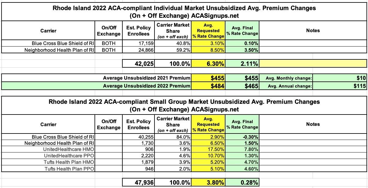 Rhode Island: Approved avg. 2022 #ACA rate changes: +2.1% indy market; +0.3% sm. group
