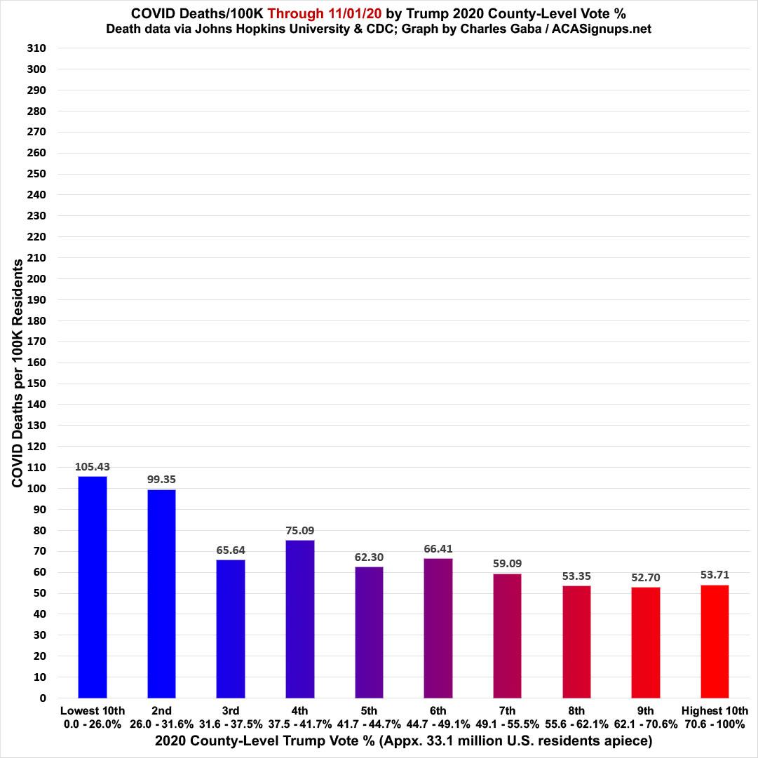 Here's what it looked like as of July 1st, 2020: The death rate in the bluest tenth of the country (first bracket) was nearly 7.6x higher than in the reddest tenth of the country (last bracket):