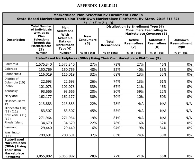 - About 3.1 million individuals selected or were automatically reenrolled into 2016 plans through the Marketplaces in the 13 states (including DC) that are using their own Marketplace platforms.