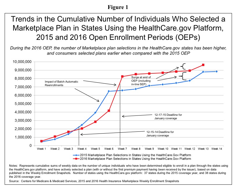 - More than 9.6 million individuals selected or were automatically reenrolled in 2016 plans through the Marketplaces in the 38 states that are using the HealthCare.gov eligibility and enrollment platform (see Table 1).