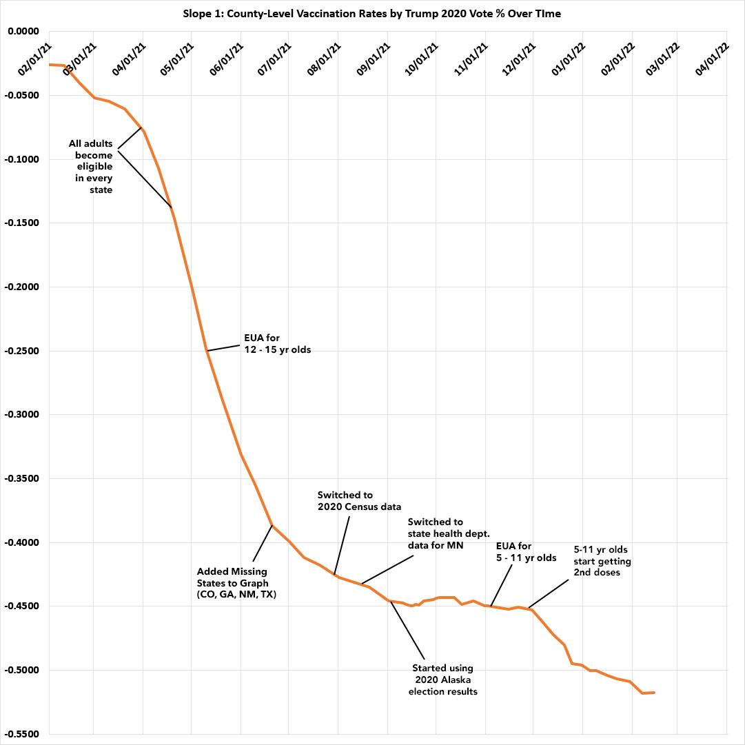 As I predicted back in mid-November, the most obvious reason for both the R-squared and slope increasing again recently is that 5 - 11 year-olds started receiving their 2nd Pfizer shot around Thanksgiving. The parents who were most likely to have gotten vaccinated themselves earlier this year are pretty clearly the ones most likely to get their children vaccinated, and the parents least likely to get vaccinated are, sadly, also those least likely to vaccinate their children either: