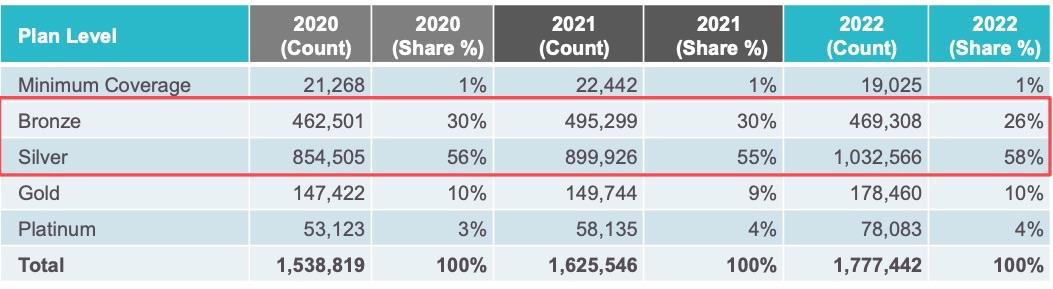 - As a share of all enrollments, Silver was chosen more in 2022 (up by 3 percentage points), while Bronze enrollment decreased.