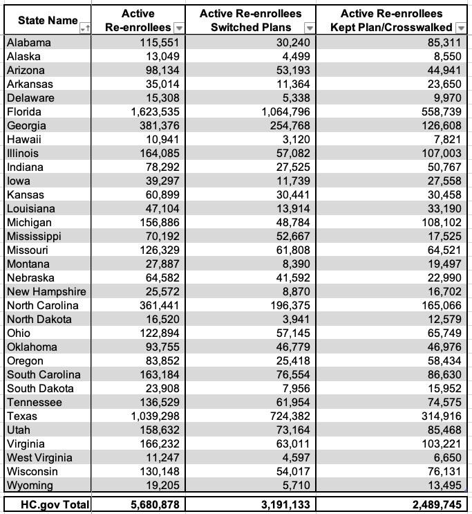 The next two tables look at the number of renewing enrollees who kept their existing (2021) ACA exchange policy vs. those who switched to a different policy for 2022. It's important to note that CMS only has data on this from the 33 states hosted on the federal exchange (HealthCare.Gov).