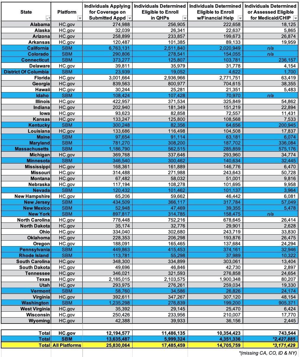 What's amazing about the Medicaid/CHIP determination column is that the state-based exchange (SBE) total is nearly 3.3x higher than the federal exchange total even without those four states included!