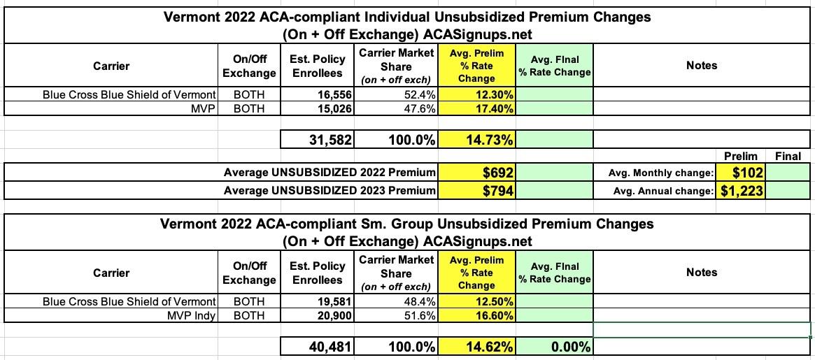 For 2023, the first state out of the gate with its preliminary rate filings is VERMONT. Vermont's filings are pretty easy to average because a) they don't redact any of their filing data; b) they make the forms easy to access; and c) they only have two insurance carriers operating in the individual or small group markets anyway (in fact, it's the same two carriers in both markets).