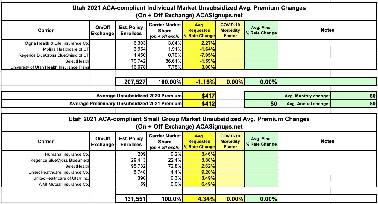 Utah: Preliminary avg. 2021 #ACA premiums: -1.2% indy market; +4.3% sm. group