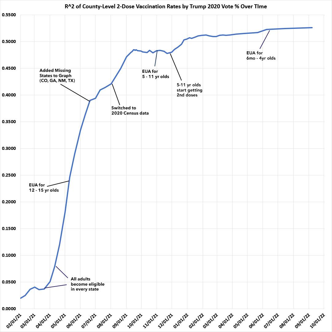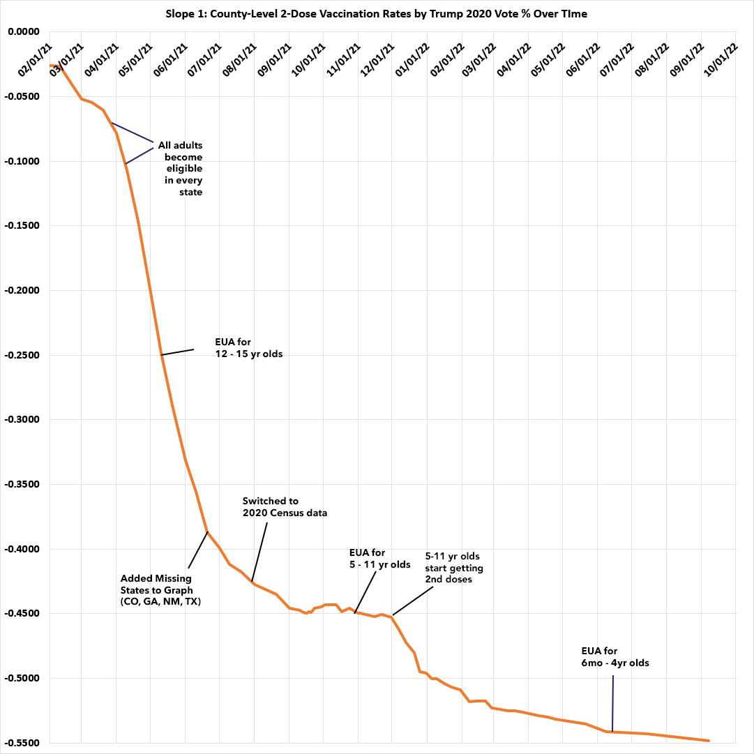 I spent over a year posting weekly updates to my vaccination-rate-by-partisan-lean graph. I then moved to monthly updates as I was backed up with other work, and my last one was back in July.