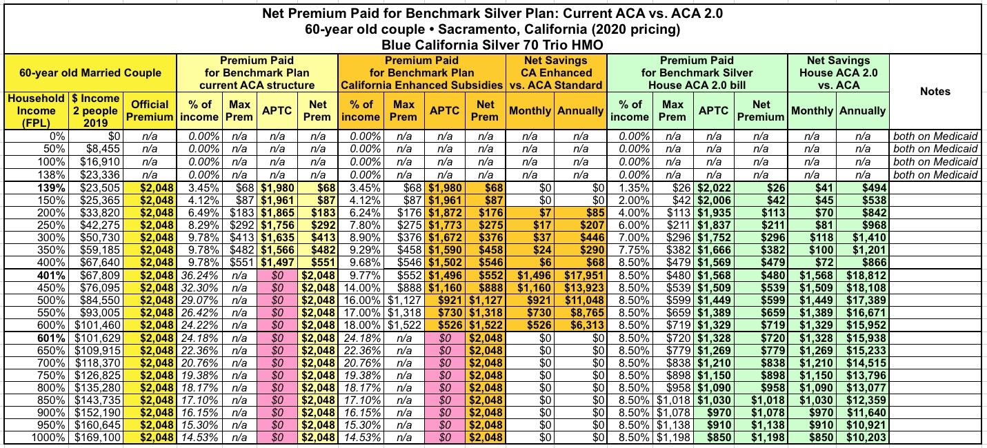 Under the expanded California subsidies, the same couple would see their premiums plummet dramatically if they earn between 400 - 450% FPL...a reduction of nearly $18,000/year, and even at 600% FPL they'd save over $6,300/year.