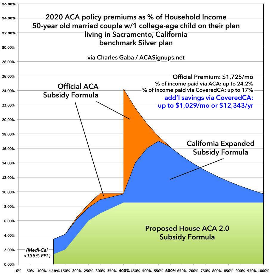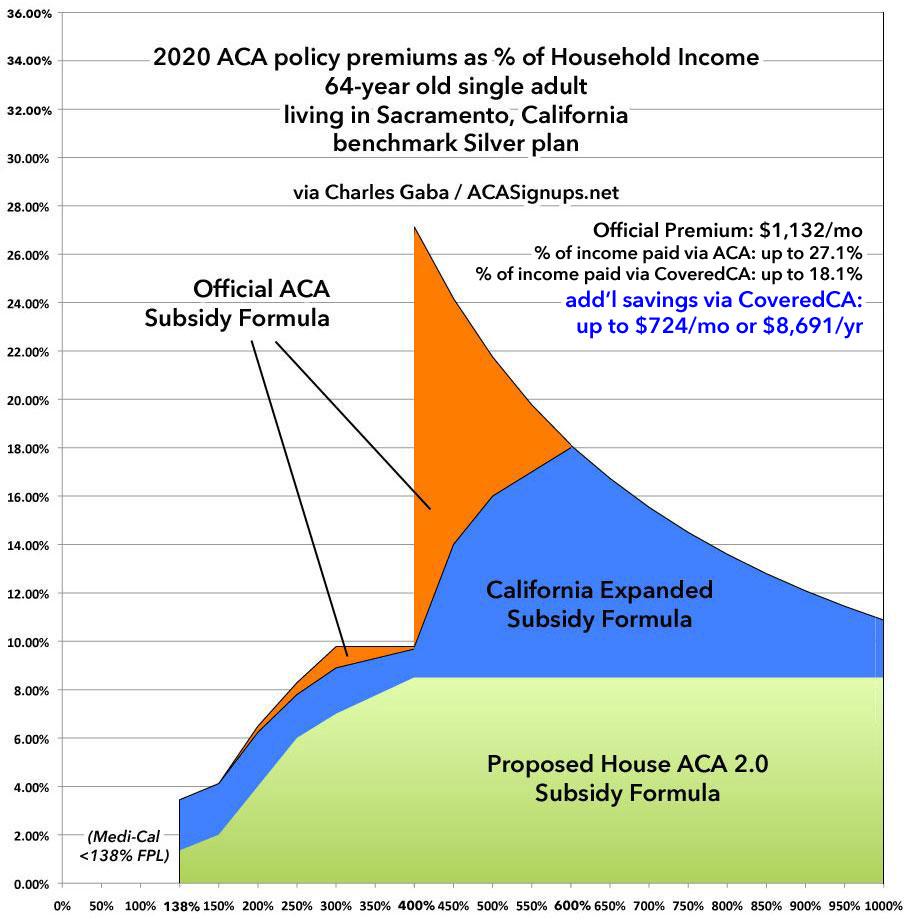 IMPORTANT: As I've noted before, Covered California has arranged to expand and enhance their ACA premium subsidies beyond the official ACA formula starting with the 2020 Open Enrollment Period. Back in October, I posted a detailed analysis, complete with tables and graphs to explain just how much hundreds of thousands of Californians could save under the new, beefed-up subsidy structure.
