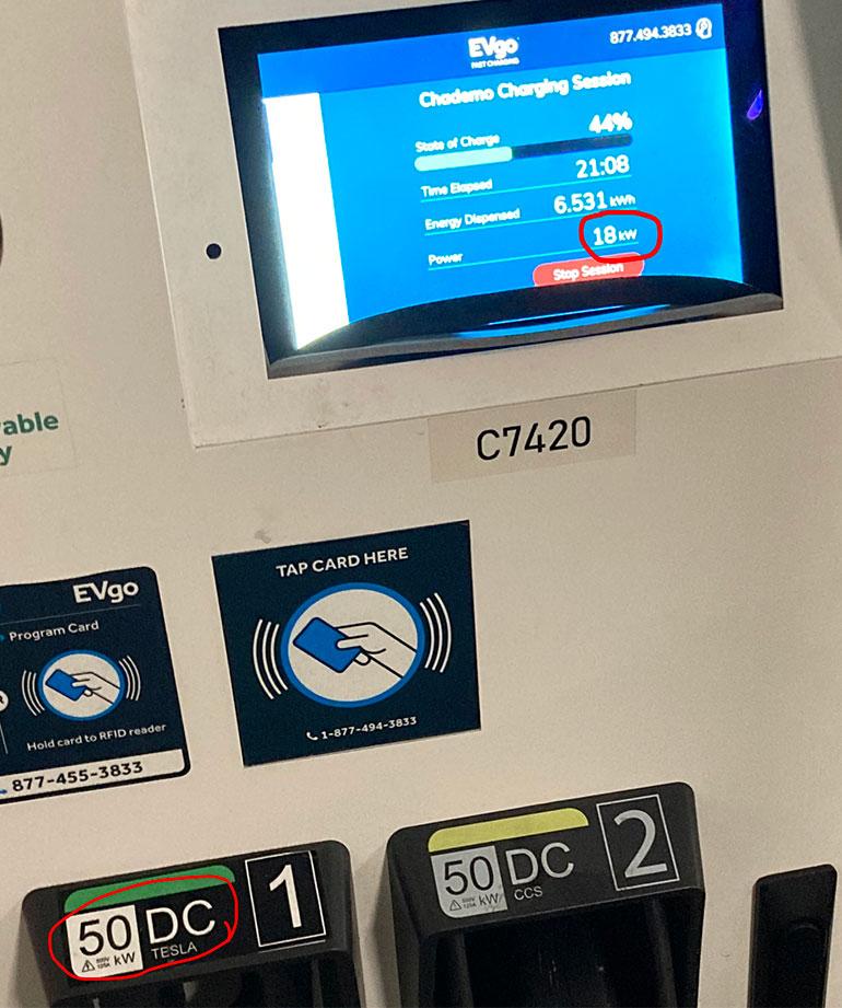 - Once they did get it working, for some reason it only charged their Tesla battery at a slow-poke 18kW rate...and that was when the battery was only at around 40% charged, so it should have been charging at pretty close to the 50 kW maximum rate.