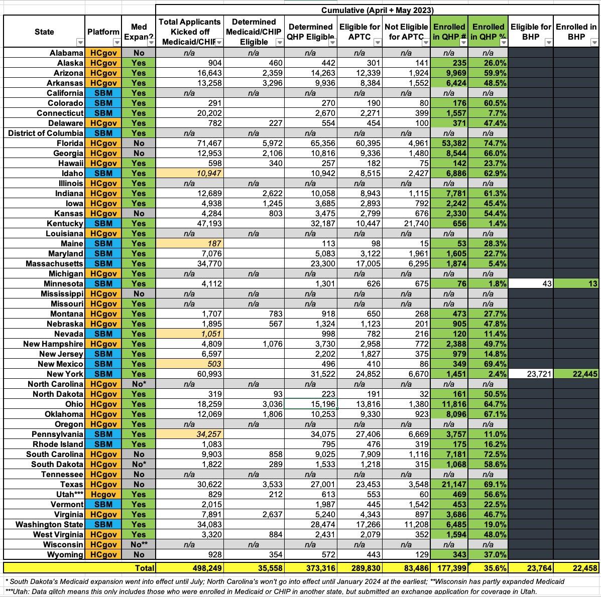 UPDATE: I've pored over the actual report itself and have reformatted and simplified the data to the best of my ability into a single table for all 50 states +DC. There are 5 state-based exchanges which included a separate number labeled "Consumers on Account Transfers Associated with a Medicaid/CHIP Coverage Denial or Termination Following Renewal." However, since this doesn't include people who actually applied to the exchanges (and it's only listed for 5 of the 15 SBM states anyway), I haven't included that number as a separate column. I've highlighted those five states in tan, however.