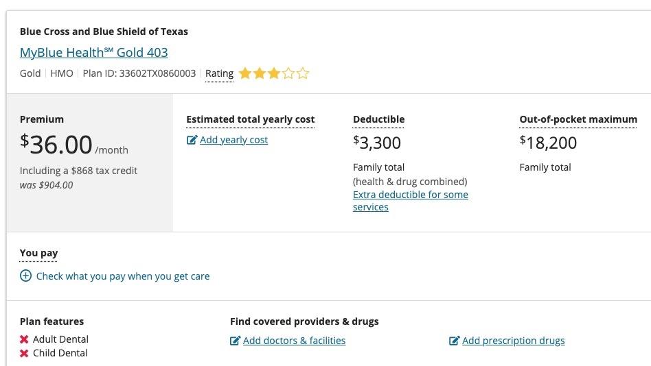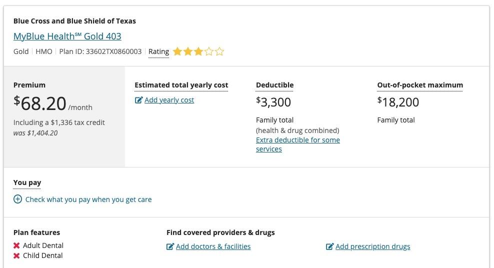 - The Gold plan would cost a bit more $86/mo instead of $68/mo, but otherwise would be the same ($3.3K deductible, $18.2K MOOP)