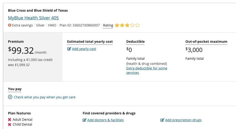 The Op-Ed claims that in this scenario, "the best option is a silver plan with a small premium combined with a small deductible" but that's incorrect as well. The lowest-priced Silver BCBSTX plan has a $99 premium with NO deductible at all (and a $3,000 MOOP).