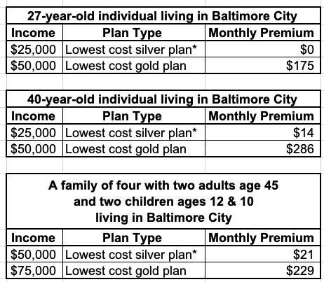 As an example, a 40-year-old living in the Baltimore metro region who makes $50,000 a year will pay a monthly premium of $286 for the lowest cost gold plan.