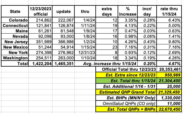 How about since then, however? Well, the table below breaks out the hard enrollment data since 12/23 which has been published by 8 of the 19 state-based ACA exchanges, then averages the per-day increases and adjusts those to bring all of them up through January 15th.