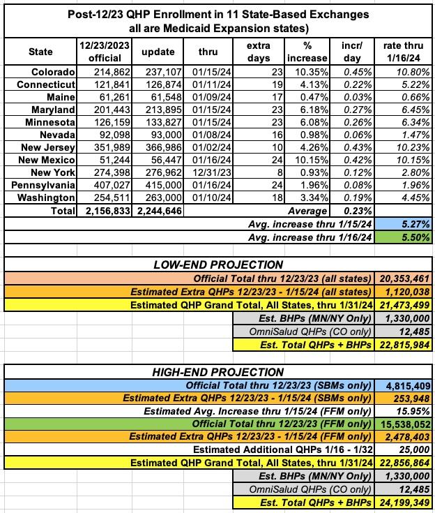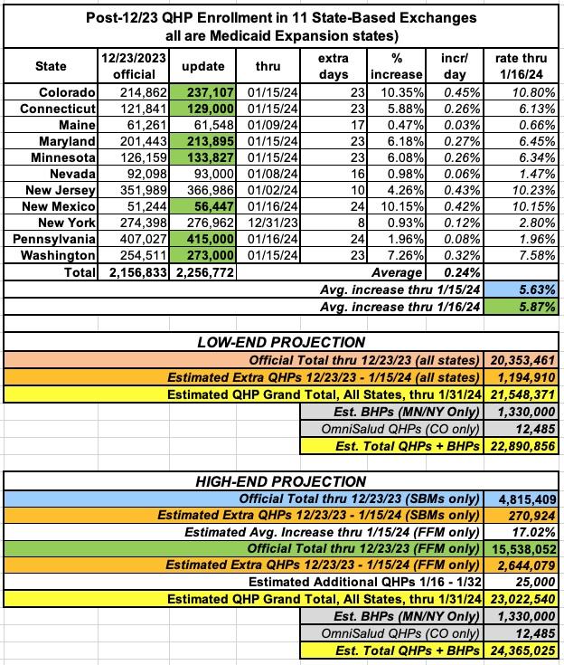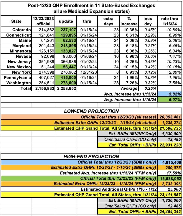 UPDATE 1/18/24: Whoa. Several more state-based exchanges have issued enrollment updates yesterday & today, including final numbers from Colorado, Maryland and Minnesota as well as a semi-final update out of Pennsylvania (which still has until Friday night before their deadline).