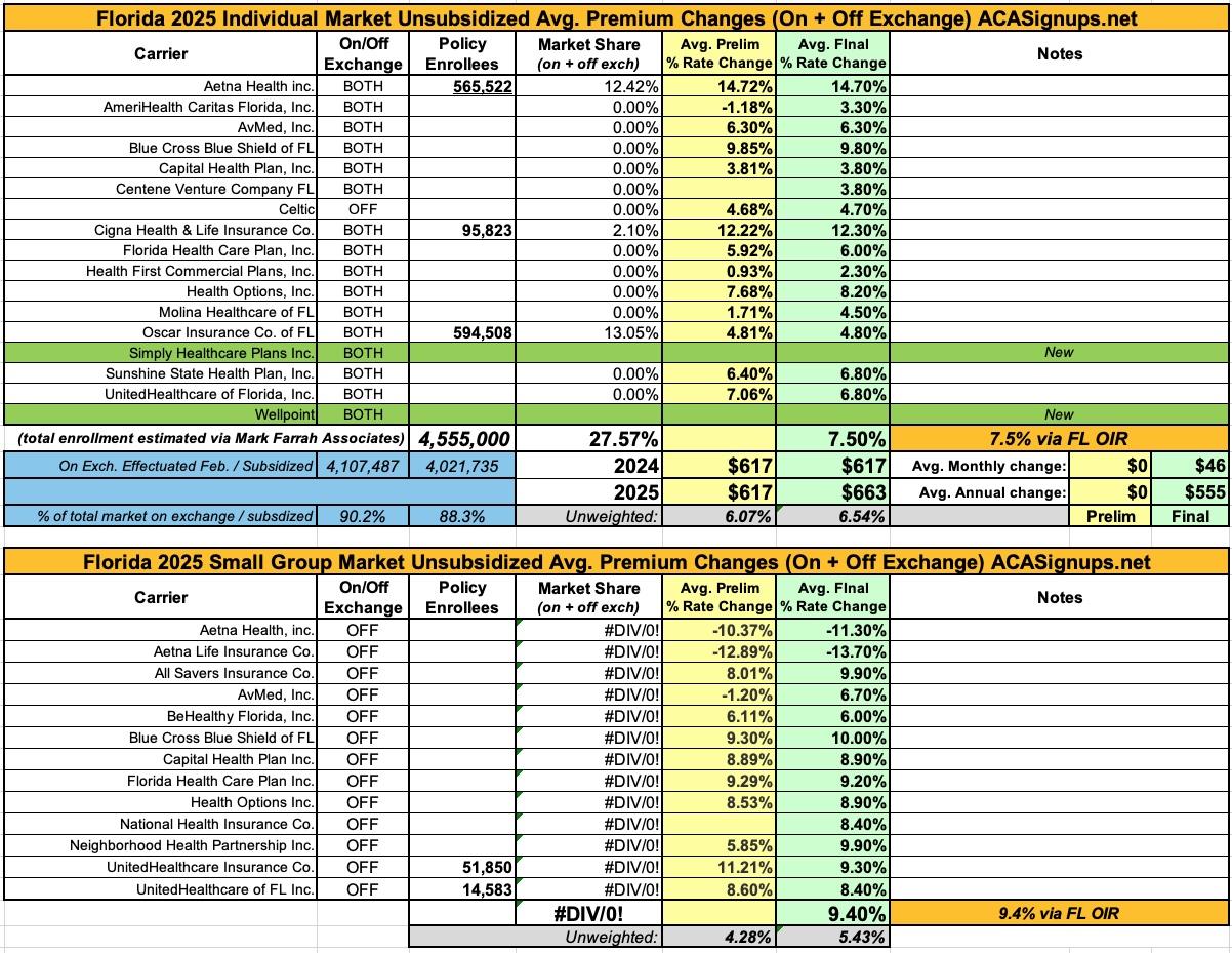 Florida: *Final* avg. unsubsidized 2025 #ACA rate changes: +7.5%; Simply Healthcare & Wellpoint joining exchange (updated)