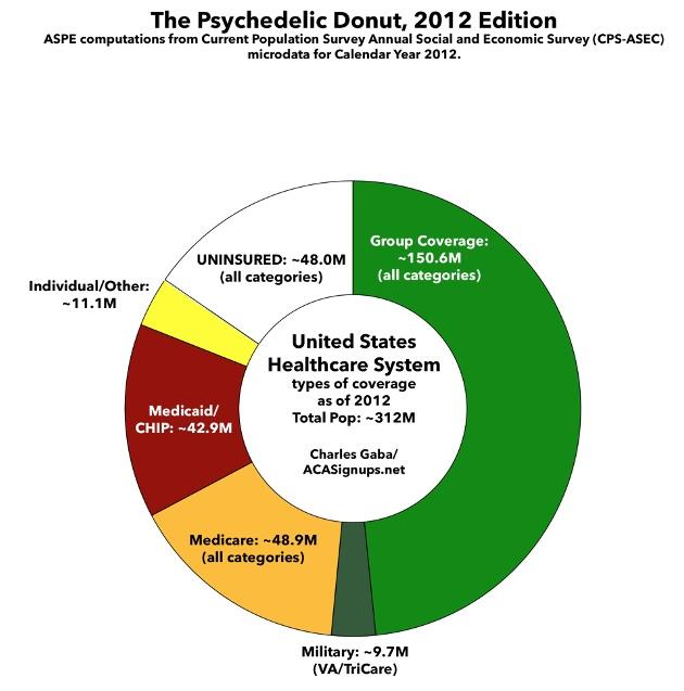 This donut graph represents the types of healthcare coverage the entire US population had as of 2012. This was shortly before most ACA provisions went into effect: