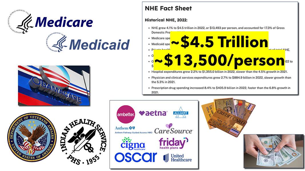 Total healthcare spending in the United States reached $4.5 trillion in 2022. Again, when I say total I mean everything: Medicare, Medicaid, the ACA, the VA, the IHS; all private insurance, all premiums, deductibles & co-pays...everything. All of it came to $4.5 trillion, or an average of $13,500 apiece.