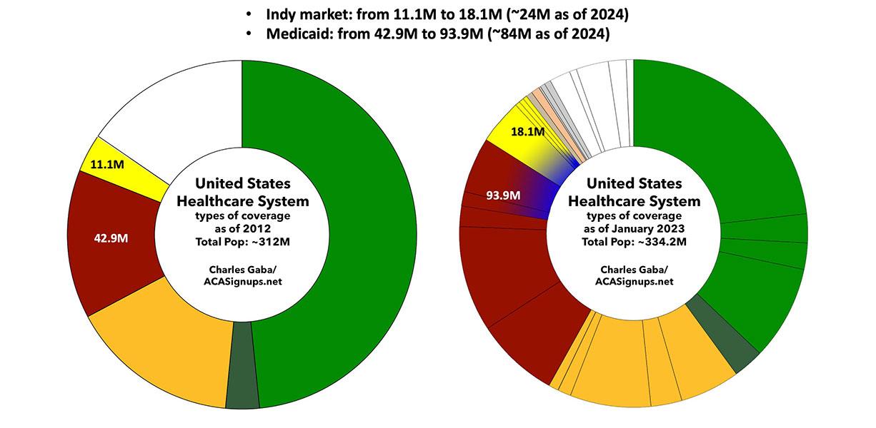 These side by side donut graphs illustrate this...although the second one only runs through 2023; as of 2024, the individual market has grown even more to around 24 million people, while Medicaid enrollment has shrunk due to the ongoing post-pandemic "unwinding" process: