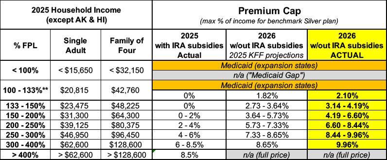 Even worse, as I wrote about separately the "revised" PAPI formula means that the premium tax credit formula is going to be stingier than the the NON-enhanced, PRE-2021 version was. Below is a table which lays out what percent of household income enrollees have to pay for the benchmark Silver plan under the current (enhanced subsidy) thresholds, the pre-2021 thresholds under the current PAPI formula, and the 2026 thresholds under the revised PAPI formula: