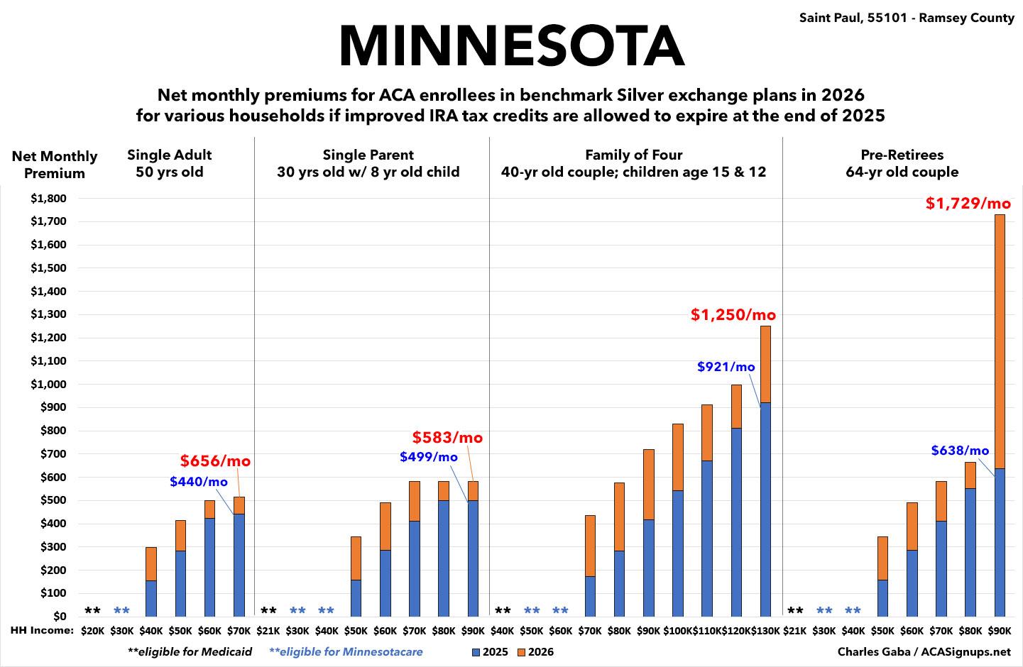 However, this gets pretty wonky and messy, so I'm not gonna criticize too much. Besides, aside from New Mexico (which is backfilling 100% of the lost subsidies for 85% of their enrollees), Minnesota is actually the state which should see the least-dramatic net premium hikes due to the federal subsidies expiring.