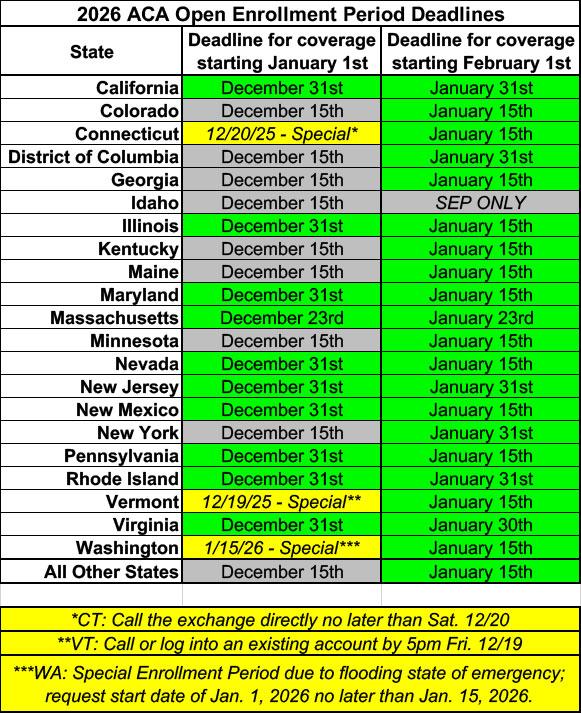 UPDATE 12/19/25: WASHINGTON STATE has extended their deadline for January 1st coverage to January 15th in response to the flooding state of emergency (you'll have to select January 1st, 2026 as your start date & will be granted eligibility via the Special Enrollment Period as long as you do so before January 15th).